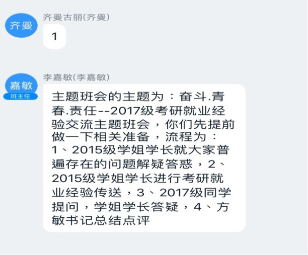 考研就业目标定位。主题班会于3月17日14:30开始在钉钉线上进行,由2017级辅导员马小又老师统筹协调,并积极联系2011级、2015级共11名毕业生参与。其中胡海鹏为山东大学推免研究生,李敏、张哲泽等为西安交通大学、东南大学等高校硕士研究生;郝梅、游晶分别为西南政法大学、重庆邮电大学移通RedDragon