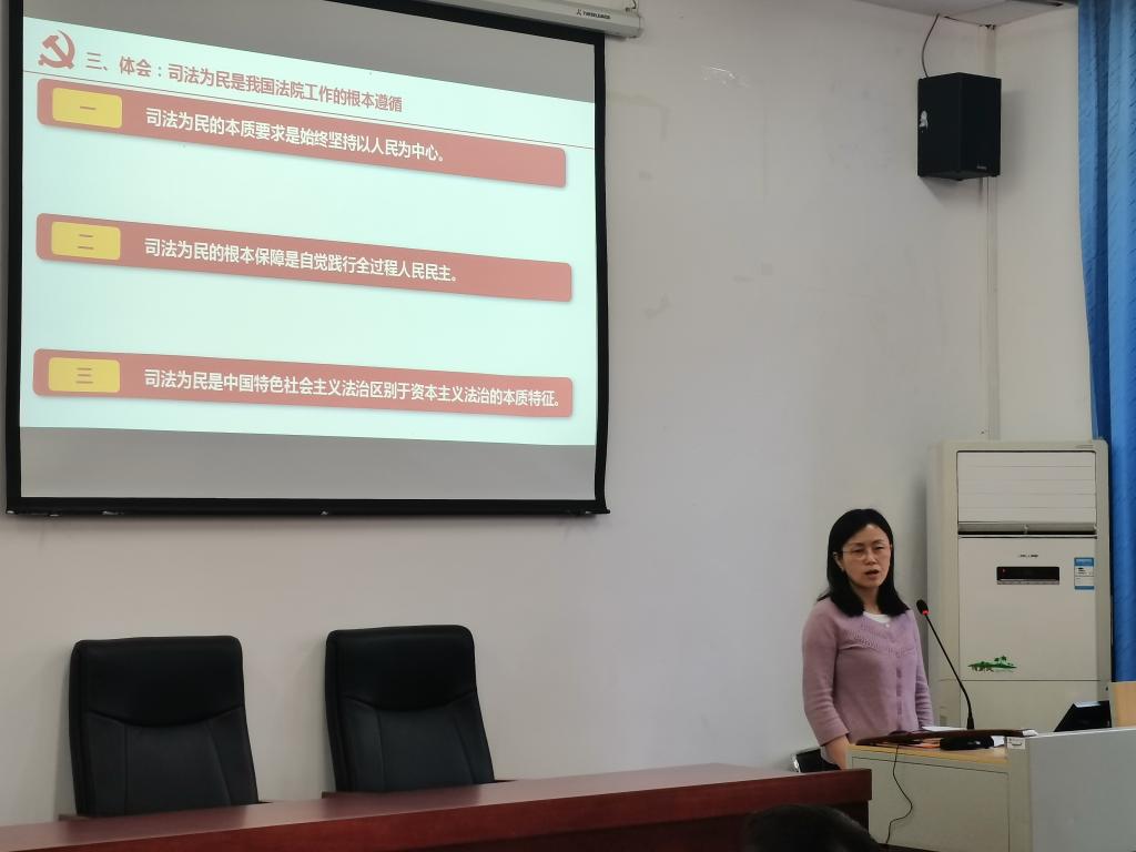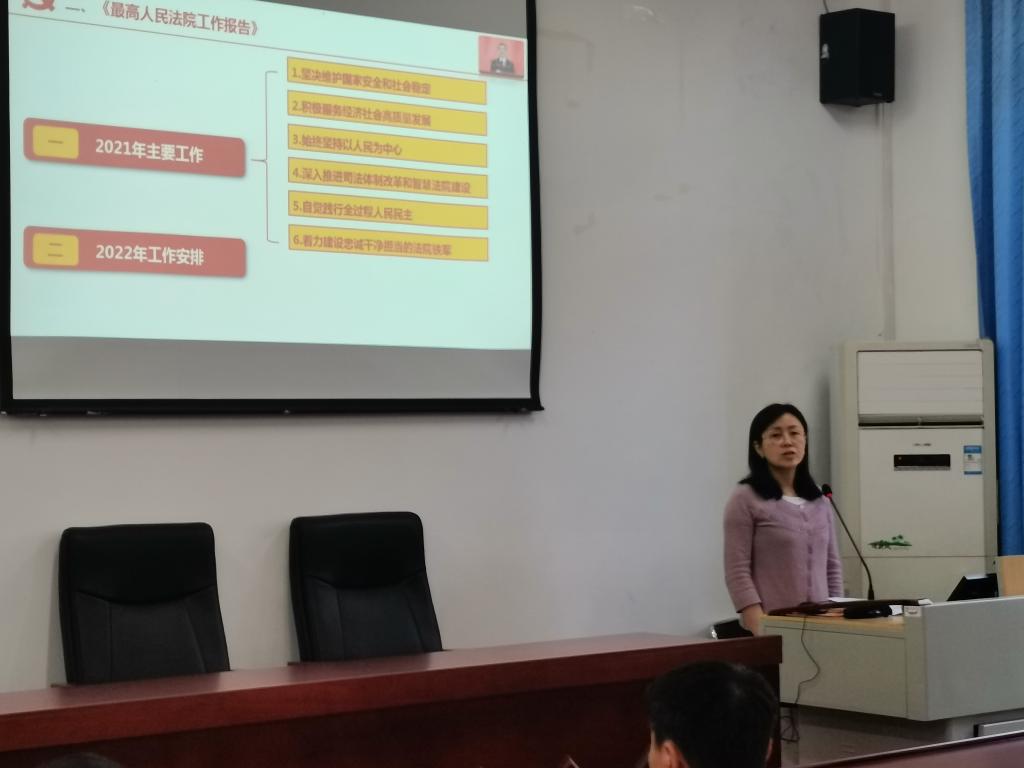 学习会上,杨桦老师主要从三个方面进行了领学:一是介绍两会概况,概述了2022年全国两会的工作内容及热点话题;二是根据自己的专业背景重点阐释了《最高人民法院工作报告》;三是从“司法为民的本质要求是始终坚持以人民为中心、司法为民的根本保障是自觉践行全过程、人民民主司法为民是中国特色社会主义法治区别于资本主义法治的本质特征”三个方面给大家分享了自己学习全国两会精神的心得体会,并强调了本年度工作报告的亮点之一在于突出强调司法为民的根本原则地位,多角度阐释了上年度法院努力践行司法为民的主要举措,满足人民群众对美好生活和公平正义向往的需要。