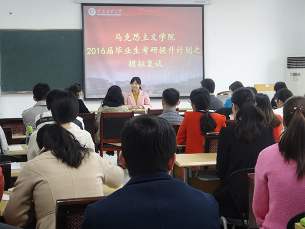 2016届毕业生考研提升计划之模拟复试”,团总支书记马小又主持本次活动,阮李全、杜红、杨頔、杨露以及魏冰娥老师担任本次模拟面试评委老师,2016届部分学生参加。