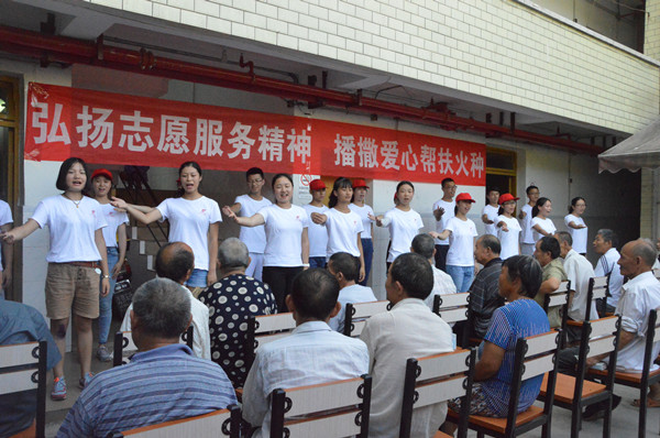 最后,志愿者们举办了精心准备的“扬新村党员风范,展和谐美好人生”主题文艺汇演,在观看汇演时,老人们掌声不断并大声叫好。汇演结束后,志愿者们的激情感染了一位老爷爷,老爷爷坚持要为大家表演歌唱《亲爱的毛主席》,老爷爷雄厚的歌声演的台下观众的一片欢呼呐喊。下午六点,志愿者们依依不舍的与老人们告别,老人们送志愿者们到了门口迟迟不肯离去,直至志愿者们消失在远方。