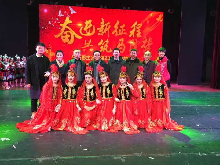 各年级的少数民族同学带来具有民族特色的歌舞串烧表演,土家族、新疆维吾尔族以及苗族的同学们用他们独特的方式展现了少数民族人民的勤劳和智慧。晚会在中国近代史纲要教研室的老师们带来的歌曲合唱《同一首歌》中圆满结束。
