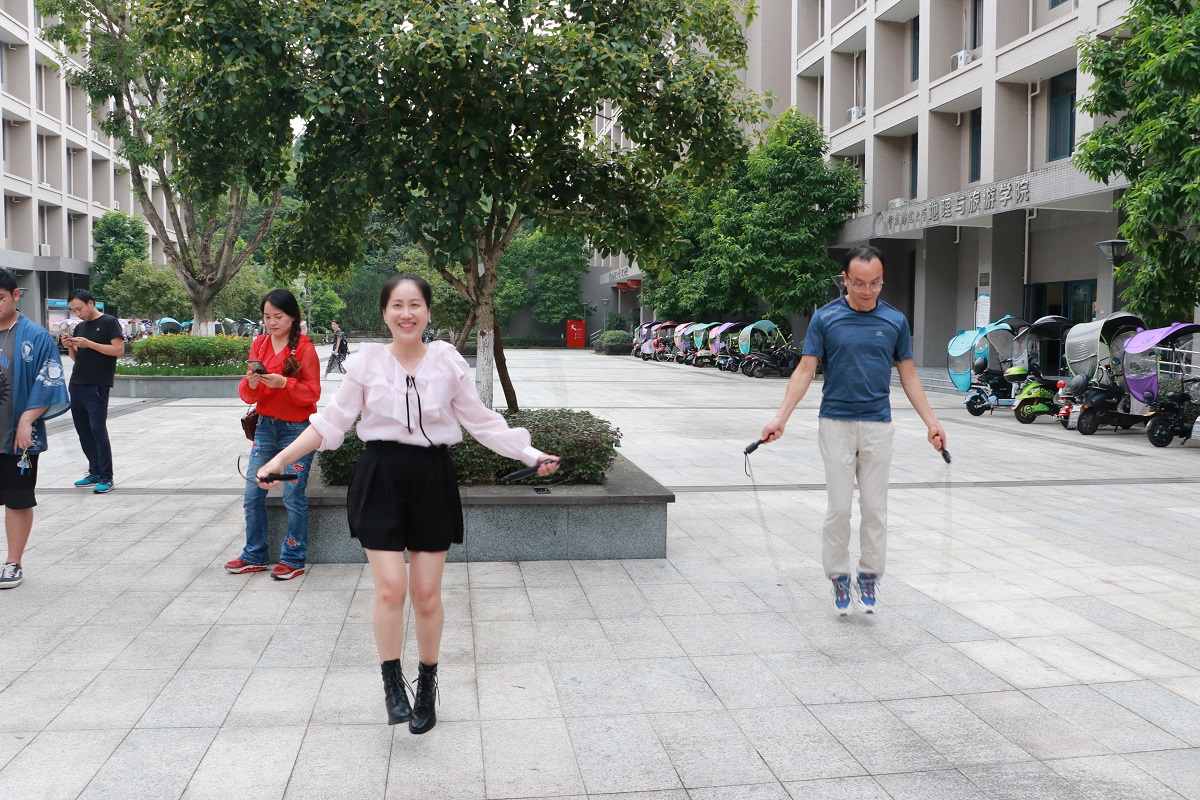 外广场,大家积极参加跳绳比赛活动。集体跳长绳项目,由工会同志组织老师们抽签按6人一组随机分组,共有6个小组参加了此项比赛;个人跳短绳项目采取自由报名方式进行,先后有15人次参与了此项比赛。经过激烈的角逐,2分钟集体计时跳长绳项目由刘寿堂、许姗姗、刘龙等11人获胜;1分钟计时个人跳短绳项目由张晓庆、高德华、赵艳华等12人获胜。获胜者以绝对的实力成为本季度当之无愧的跳绳“健康达人”。