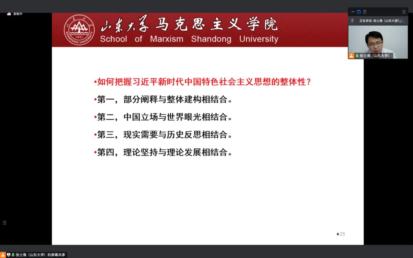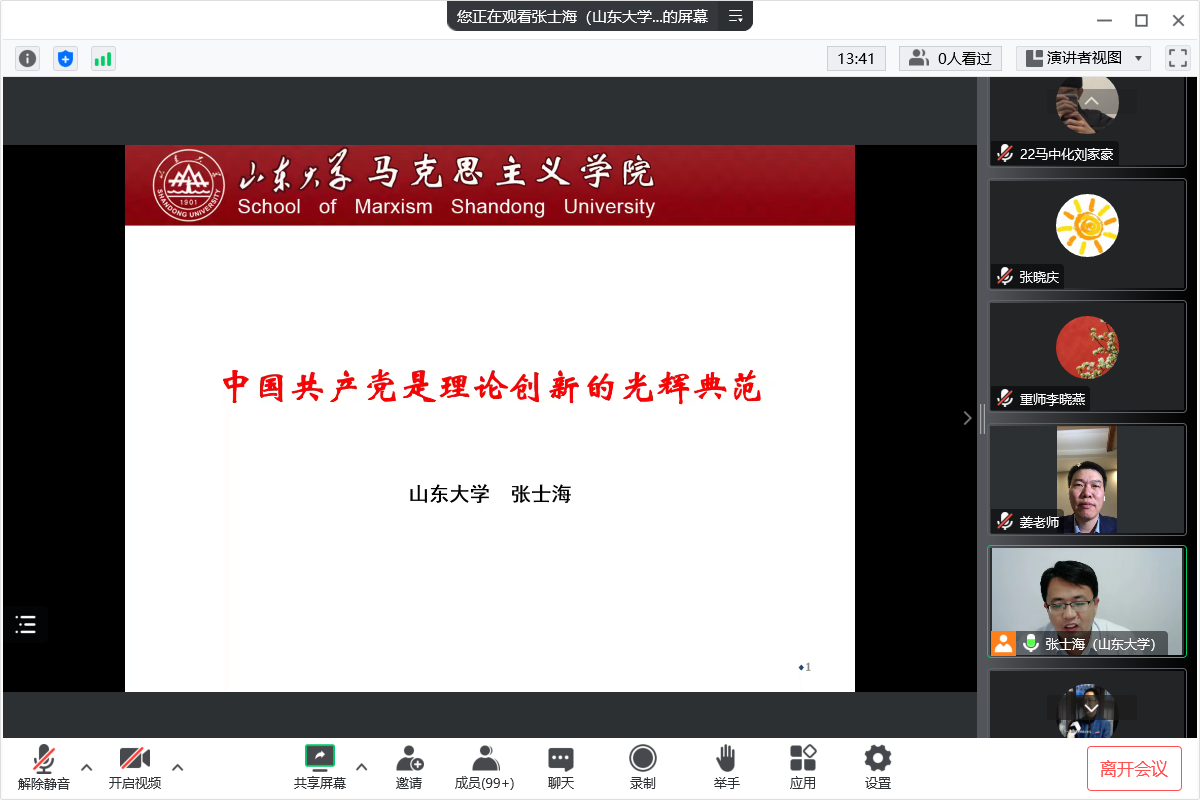 张士海教授结合党的二十大报告的第二部分“开辟马克思主义中国化时代化境界”的内容,围绕中国共产党是理论创新的光辉典范这一主题,从中国共产党理论创新的历史进程、主要成果、基本经验和时代要求这四个方面展开了详细阐述。