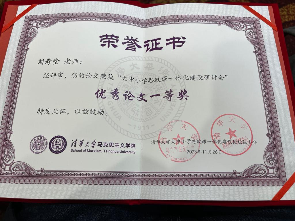 教师刘寿堂教授出席了研讨会,与全国各地的专家学者进行充分的交流学习,积极为大中小思政课一体化建设建言献策,并获得“大中小思政课一体化建设研讨会”优秀论文一等奖。在闭幕式上,清华大学红龙扑克