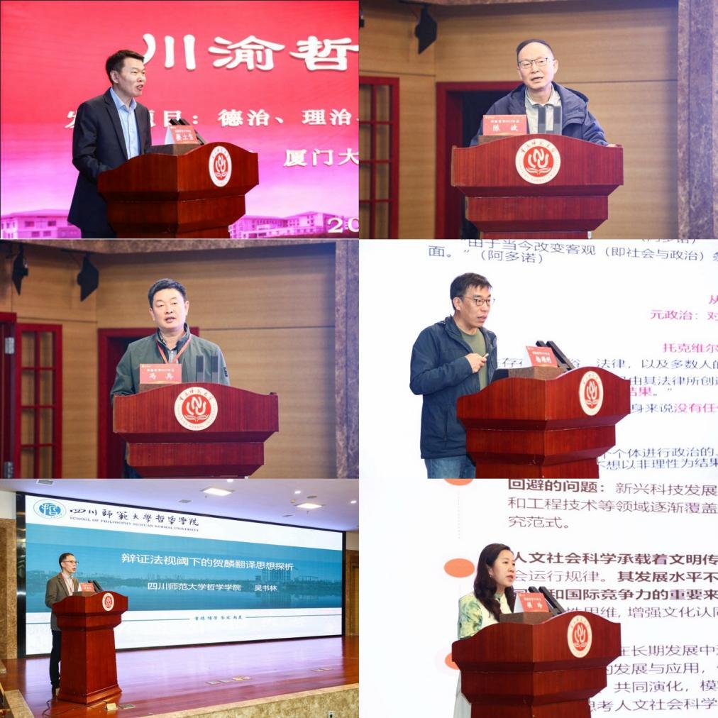 教授文学平点评。四川大学陈波教授以“马克思哲学的基本问题意识:以《德法年鉴》谈起”为题,系统梳理了马克思哲学形成的理论脉络与核心问题意识。厦门大学冯兵教授以“德治、理治与无为而治:《论语》为政之道探析”为题,从“为政以德、治国以礼、无为而治”三个方面论述儒家的为政之道在执政伦理、管理智慧与政德修养等方面仍有现实价值与启示。四川大学杨顺利教授以“监护、成熟与自律:阿多诺论元政治”为题,从“何谓元政治”出发,得出阿多诺关于成熟的主体摆脱被监护状态,能在自己的生活中承担责任的结论。四川师范大学吴书林教授以“辩证法视阈下的贺麟翻译思想探析”为题,从“主客体关系下翻译的意义、共性个性关系下的翻译本质、形意关系下的翻译标准”三个方面进行分享。重庆师范大学侯玲教授以“人工智能时代人文社会科学知识生产范式重构”为题,从“人文社会科学知识生产转向”出发,阐述人机协同知识生产范式下人文社会科学知识生产的主体性困境及其超越。