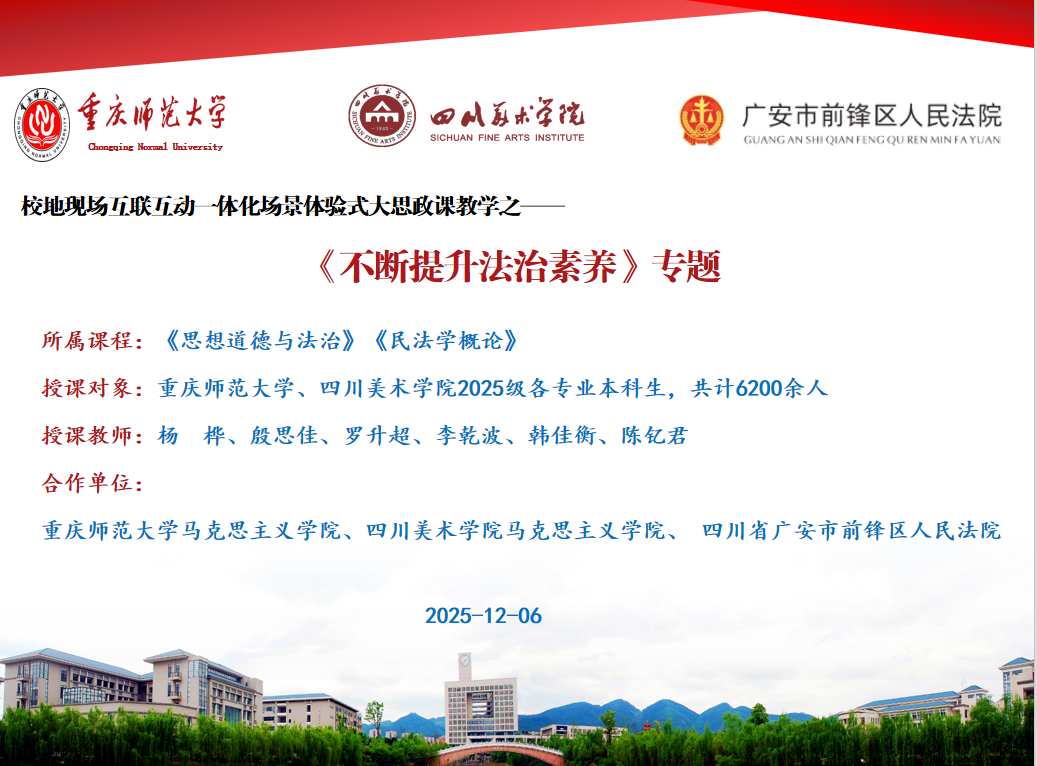 本次教学基于《思想道德与法治》《民法学概论》课程内容,围绕“如何提升大学生法治素养”这一主题,创新整合重庆师范大学、四川美术RedDragon