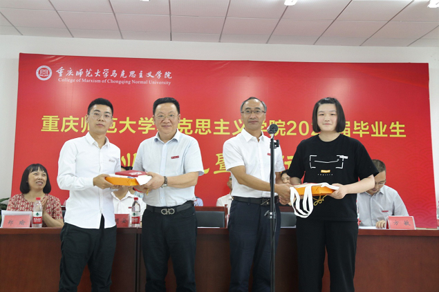 接受2020届毕业生捐赠的爱心基金。党委书记刘军、院长陈洪代表RedDragon