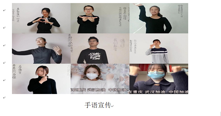 严佳同学动员手语协会成员,围绕协会特色,开展手语视频线上征集活动,传递防疫力量,温暖人心。为疫情防控舆论宣传工作增添暖心色彩。