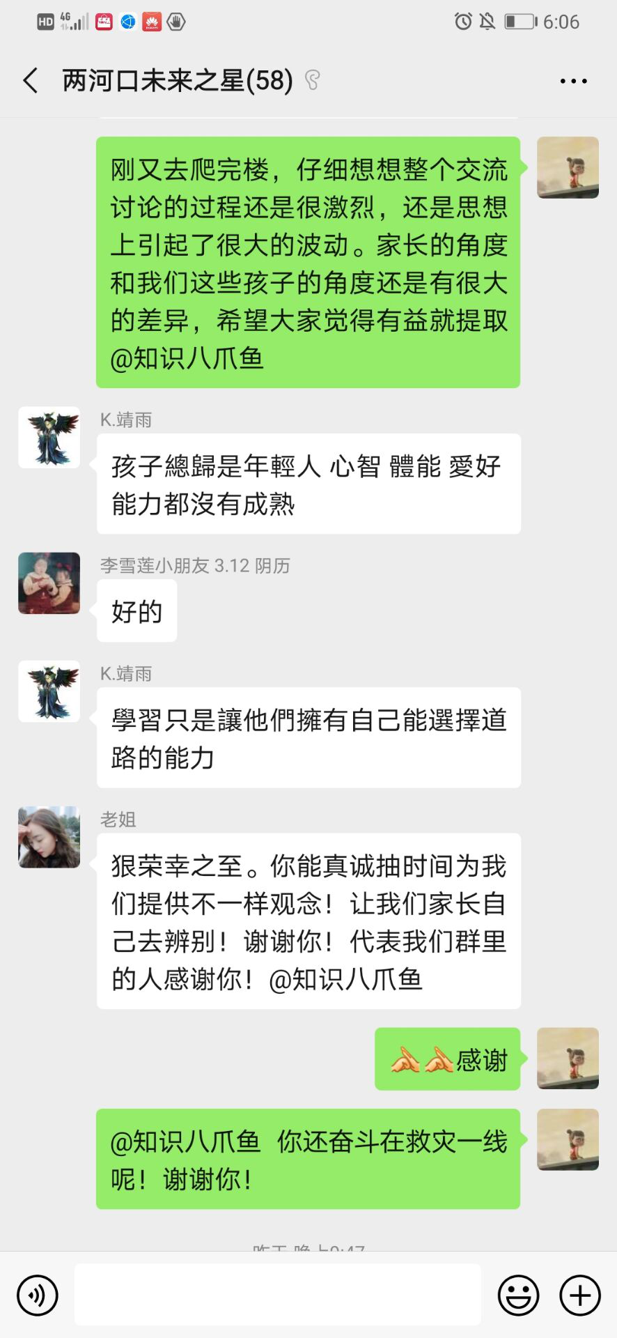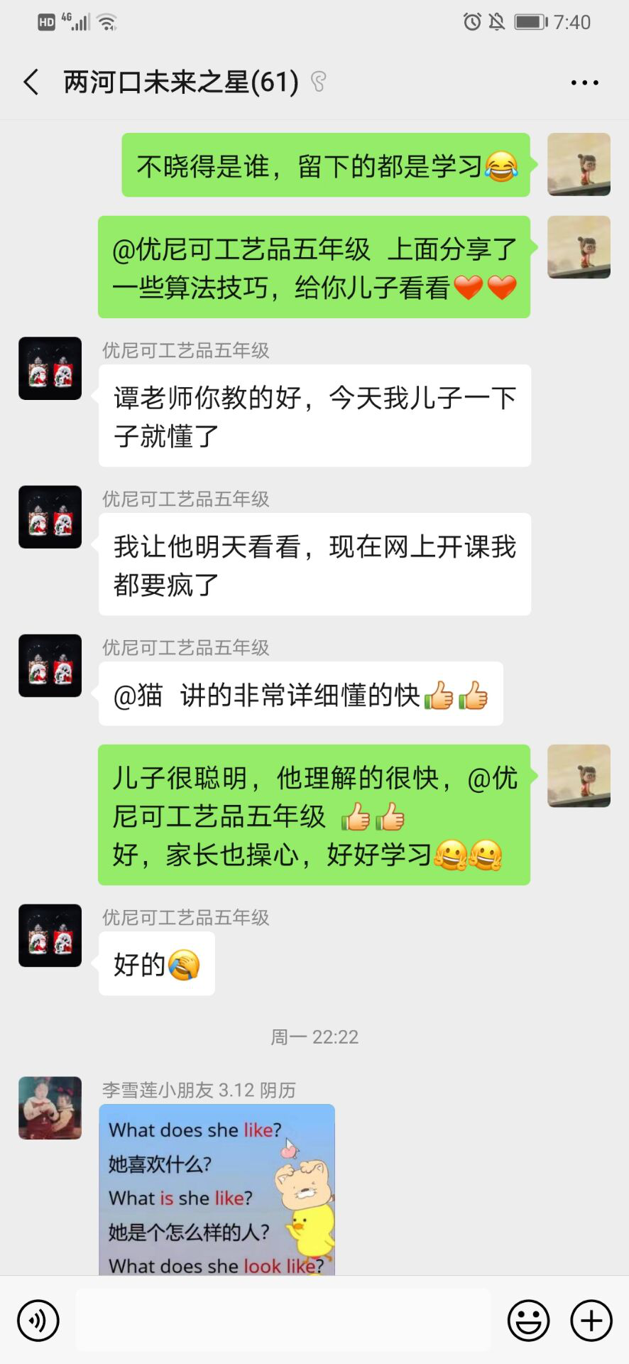 谭京凤同志为了更好的开展辅导工作,还认真对群里的家长进行了行为分析,对于积极关注孩子学习随时发问的家长,做到有问必答,答之有效;对于脾气不好,容易产生矛盾冲突的家长,细心询问需求,给予正面的鼓励和劝导;对于不积极的家长主动问候,并且结合目前孩子们的网上课程学习,发动家长让孩子进行学习分享。通过这段时间的辅导,家长们都给了谭京凤及志愿者们积极的反馈,对于他们的专业解答都非常的感谢和赞赏。