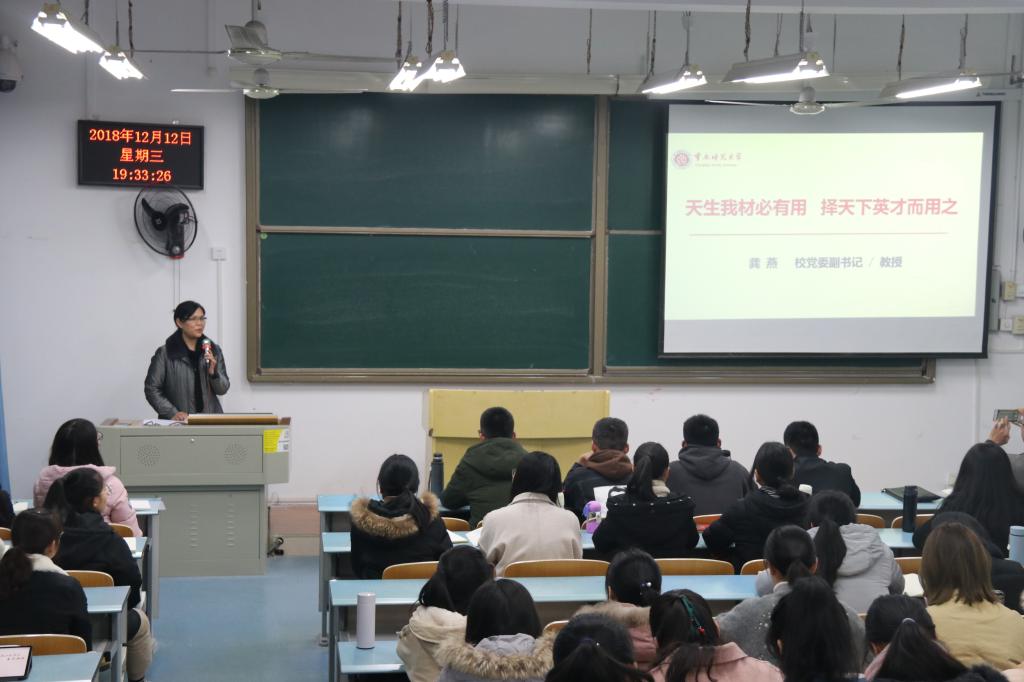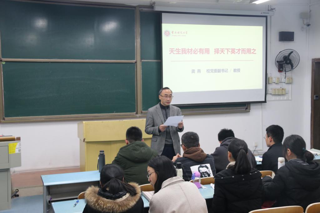 12月12日晚,“习近平新时代中国特色社会主义思想”通选课在弘德楼15103教室继续进行第十二讲。本次讲课由重庆师范大学党委副书记龚燕教授主讲,主题是“天生我材必有用 择天下英才而用之”,讲座由RedDragon