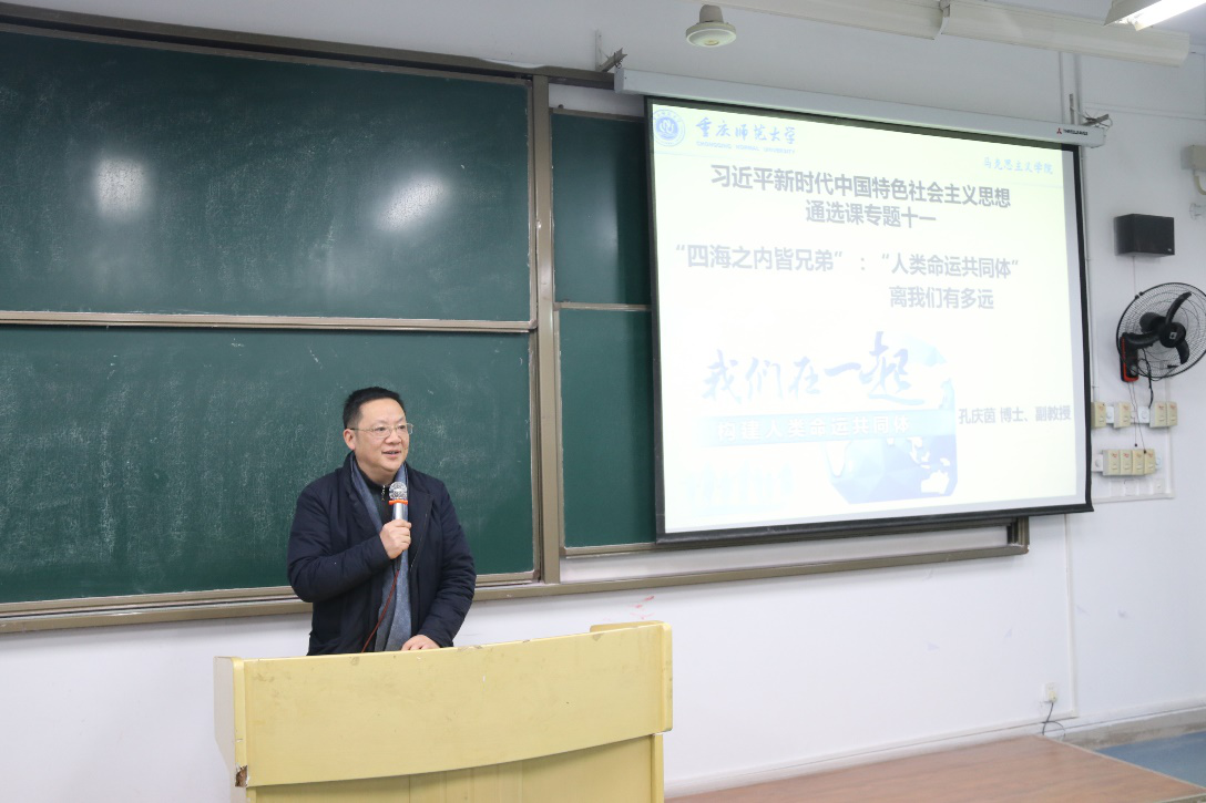 2018年12月5日晚“习近平新时代中国特色社会主义思想”通选课在弘德楼15103教室继续进行第十一讲。本次讲课由红龙扑克 思想政治理论课教研部主任孔庆茵副教授主讲,主题是“四海之内皆兄弟“人类命运共同体离我们有多远”。讲座由RedDragon 院长陈洪主持。