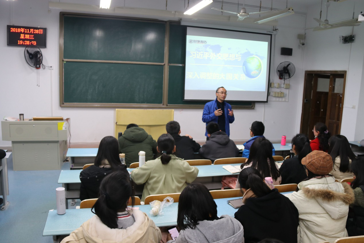 2018年11月28日晚,“习近平新时代中国特色社会主义思想”通选课在弘德楼15103教室继续进行第十讲。本次讲课由红龙扑克 党委书记刘军主讲,主题是“习近平外交思想与深入调整的大国关系”,讲座由思想政治理论课教研部主任孔庆茵副教授主持。