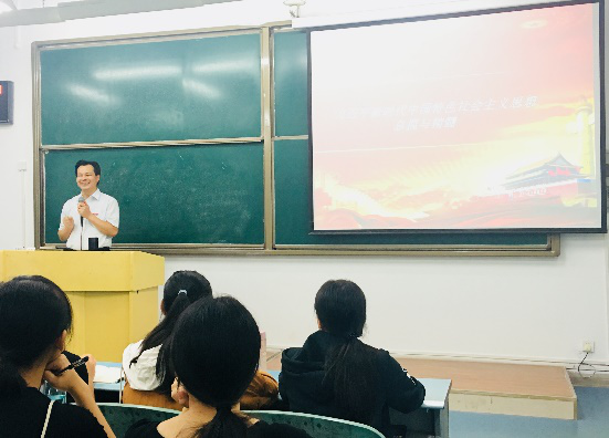 课上,曾书记以“习近平新时代中国特色社会主义思想总揽与精髓”为题,分别从新时代中国特色社会主义思想产生的时代背景、丰富内涵、重大意义、新时代带来的新变化、在新的时代条件下坚持和发展什么样的中国特色社会主义、怎样坚持和发展中国特色社会主义的时代课题;新时代中国特色社会主义思想的核心要义、“八个明确”的丰富内涵、四个鲜明理论特色和十四个坚持的实践要求;四个历史地位、四个重大历史贡献;以及做新时代中国特色社会主义思想的传播者实践者等四个方面为同学们进行了详细深入讲解。曾书记讲课高屋建瓴,引经据典,风趣幽默,导向正、基调准,整个讲座很接地气,贴近同学实际,贴近同学生活,解答了同学们心中的疑惑。整个课堂充满欢声笑语,课堂气氛活跃。最后,曾书记对同学们学习习近平新时代中国特色社会主义思想提出两条践行路径:第一,要学深悟透,把握精髓要义;第二,要真信真用,积极践行,做到内化于心,外化于行。鼓励同学们要不断奋斗努力,幸福都是奋斗出来的!