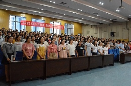 概况、师资力量、学生考研就业等方面做了详细阐述,并为新生们介绍了全体老师。随后,教师代表兰桂萍发表讲话,对同学们提出了四个期望:修德立身、学会阅读、坚韧立志、学会担当。希望新同学们能提升自我、充实大学生活,不负韶华。