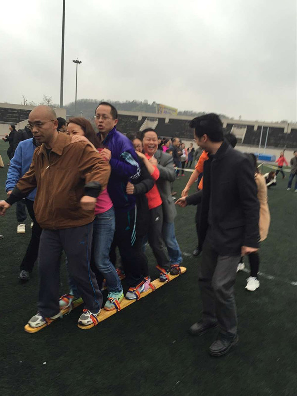 为单位,分为“女王”五人组和男女六人混合组,参赛小组被两条木板固定为一个整体往返跑道,用时最少者获胜。
