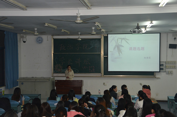 2013、2014级在弘德楼5201教室开展了学长讲堂活动,特邀2012级在学术科研方面有一定成绩的彭镜、向海霞、杜中波三位学长为同学们答疑解惑,辅导员张晓庆老师以及2013、2014级全体学生参与。