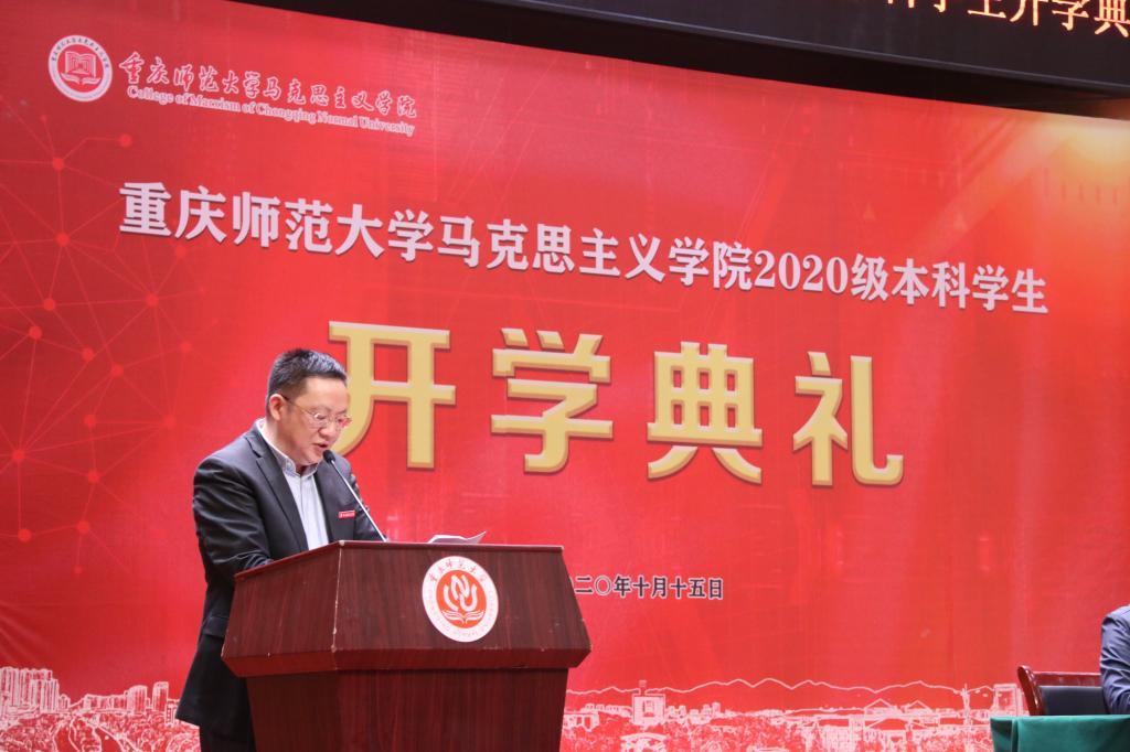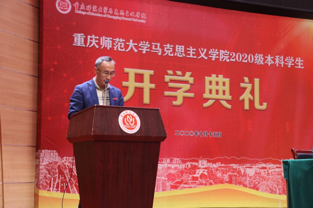 紧接着,院长陈洪发表讲话,陈洪院长引用孟东方校长在全校2020级开学典礼上的讲话,强调立德树人、实践育人、环境塑人、功业成人的重要性。此外,陈洪院长同新生分享自身对“崇德、尚美、博学、笃志”院训的理解,借用习近平总书记在北京大学师生座谈会上对青年的寄语与2020级全体新生共勉,希望新生坚定理想信念、不辱时代使命、不负人民期望,勇做担当民族复兴大任的时代新人。