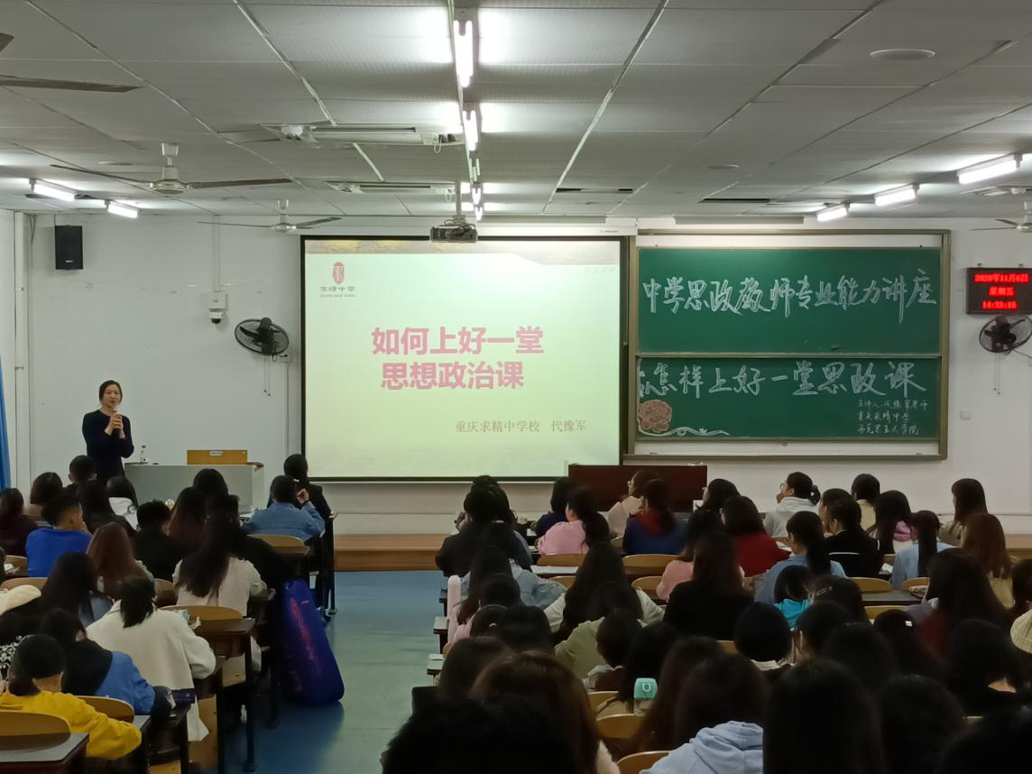 举办中学思想政治专业能力培养系列讲座第二讲,邀请重庆求精中学校政治教研组长,教育部“一师一优课,一课一名师”活动“优课”评审专家代豫军老师在砺志楼2505为2018级思想政治教育专业本科生和2020级学科教学(思政)研究生带来一场题为“怎样上好一堂思政课”的专题讲座。红龙扑克