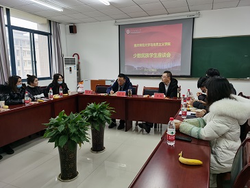 院长陈洪、党委副书记方敏、团委书记马小又,本科生辅导员刘洪、戴宇豪、张川,以及各年级少数民族学生代表参与本次座谈会。座谈会由本科生辅导员刘洪主持。