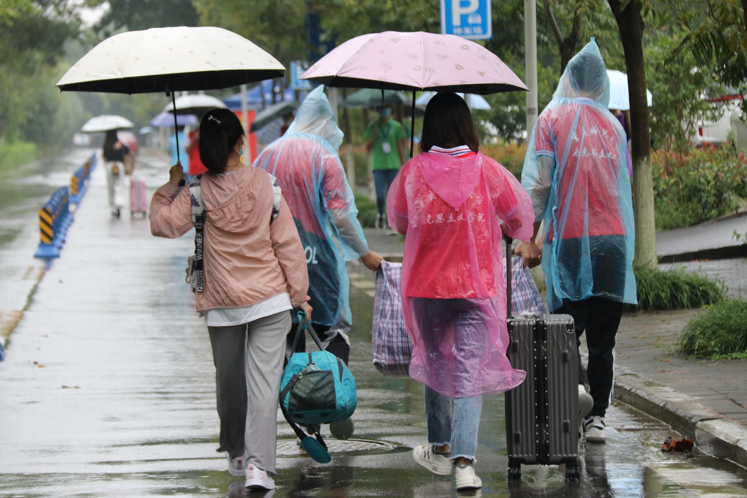 报到点,在迎新站办理好手续后,由志愿者点对点帮助新生搬运行李,带领他们进入宿舍,完成报到的所有流程。