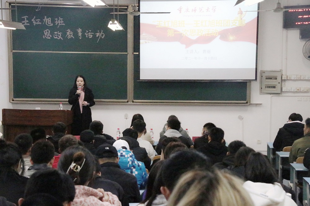 紧接着,曹丽老师介绍了组建王红旭班的初心:学红旭精神,做红旭青年。曹丽老师强调作为首个以“时代楷模”名字命名的班级成员,同学们更应严格要求自己,提高自己的素质修养,拥有高尚主义情怀。曹丽老师鼓励同学们以“时代楷模”王红旭为榜样,成为拥有正能量的人,团结一心,将英雄精神内化于心、外化于行。