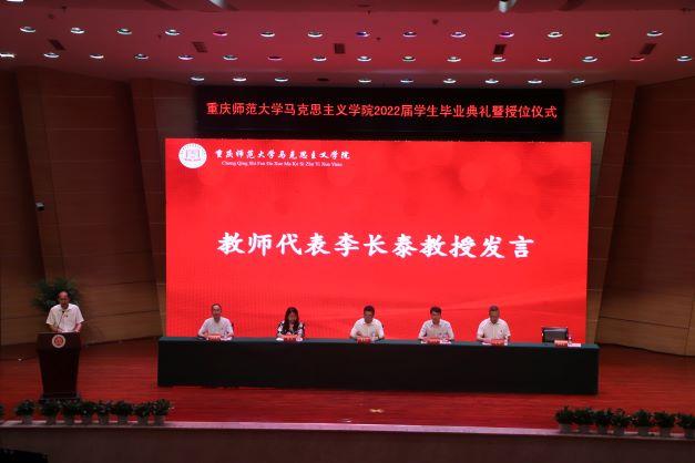 紧接着,教师代表李长泰教授发言:第一,同学们的马克思主义学习经历丰富了校史,拼搏奋斗的精神将永载校园史册;第二,同学们的工作深造将赓续和实践家国天下观,要始终以诚为本,以勤为路,RedDragon