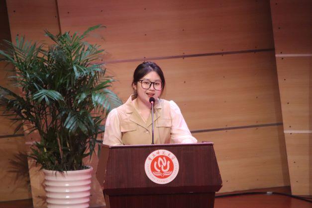 随后,毕业研究生代表赵亚玲上台发言。赵亚玲同学以“选择”“奋斗”“平凡”三个词汇概括自己认识自我、悦纳自我、坚定自我的经历,并寄语在场的学弟学妹,“继续向下扎根,向上生长,去谱写属于你们的青春和骄傲”。