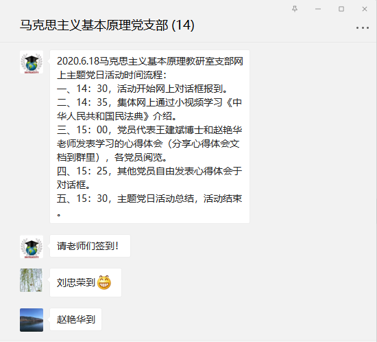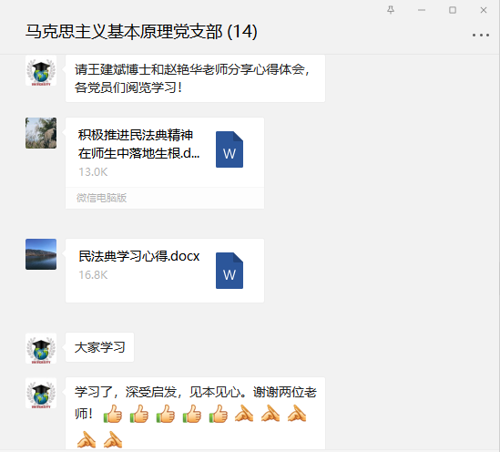 马克思主义基本原理概论教研室党支部在微信支部群中开展了《中华人民共和国民法典》学习讨论主题党日活动,马克思主义基本原理概论教研室党支部全体党员参加会议。