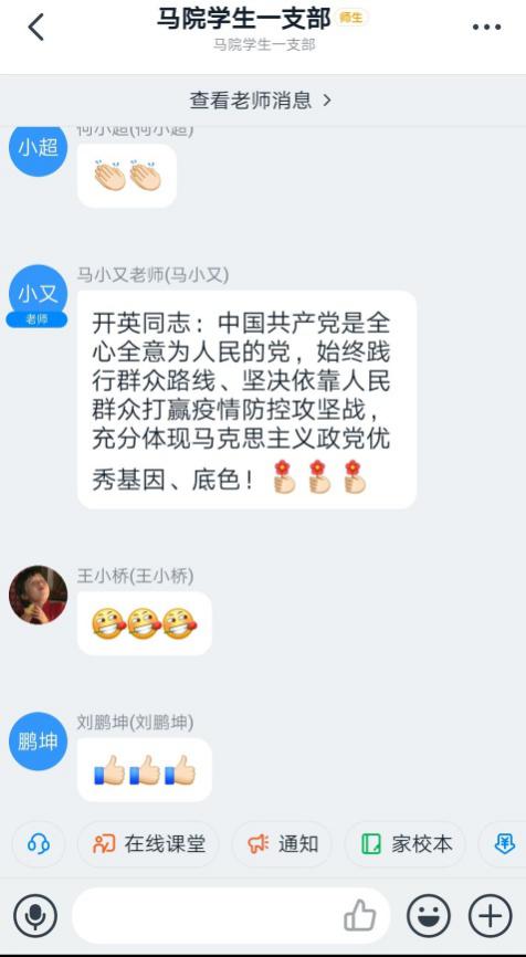 专业课教师,同时又兼任2019级弘博班辅导员,他身处湖北疫区,时刻牵挂学生身心健康,在扎实做好线上教学工作的同时按时保质地做好学生疫情摸排工作。周老师在分享中谈及了身边现状和自己的真实感受,并通过对国内国外舆论动向的分析,为大家树立了全局观念、大局观念,肯定了我国的政治体制,增强制度自信。王娜同志向大家分享自己担任街道“疫情”新闻写作志愿者时采访的两个真实案例,真切而感动,表达了自身努力做一名向上向善好青年的决心。张倩同学分享了自己在村中的志愿者生活,她说,国家和人民需要我,我就要贡献出我的一份力量。王小桥同志参加了由重庆师范大学民政基地发起的线上爱心辅导活动,向大家介绍了活动的情况和自己所作的工作,她说,能利用自身的专业知识,奉献疫情、服务大众,为国家贡献出一份青年的力量我感到荣幸。