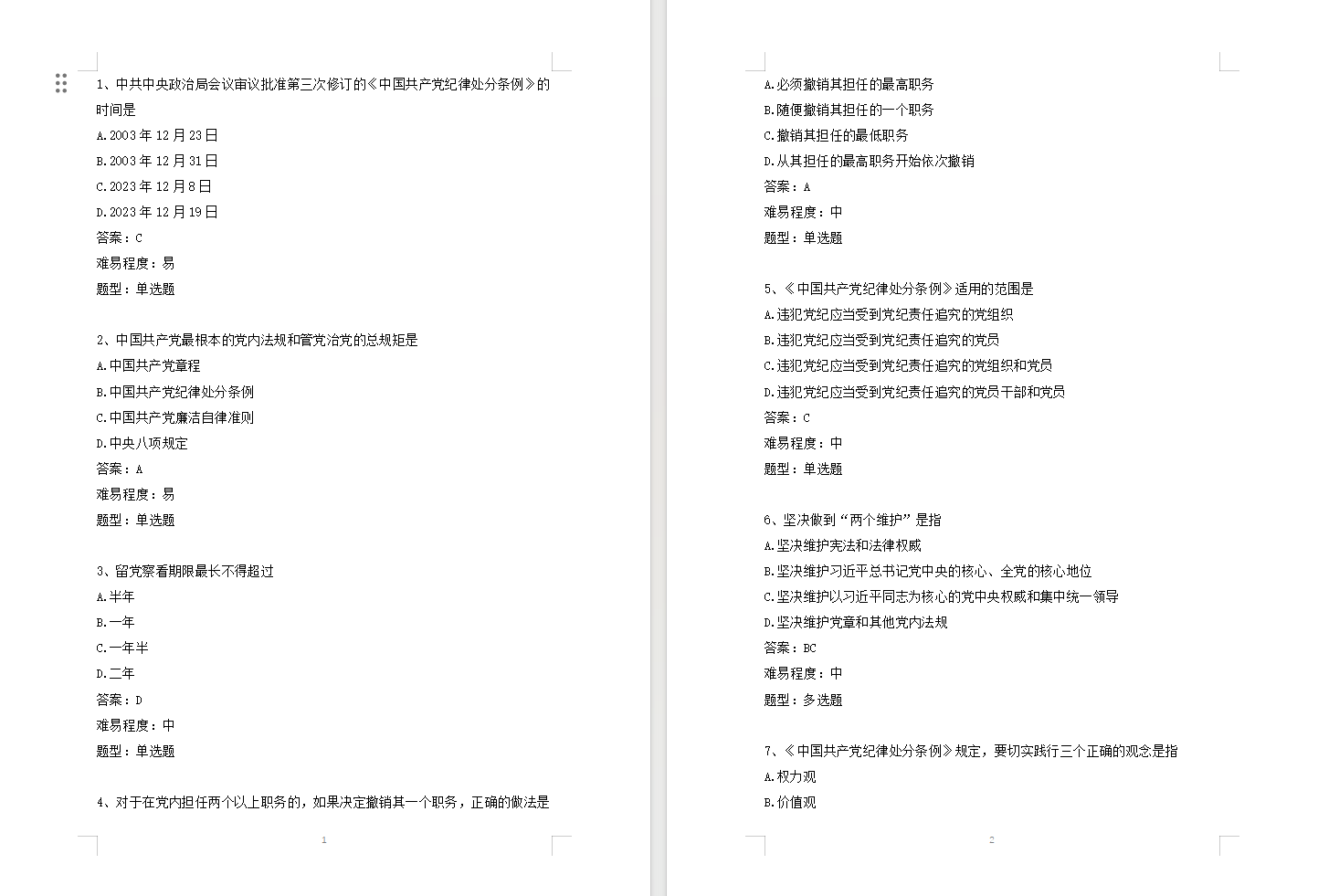 为深化学习成效,5月初,支部集结形成了《<中国共产党纪律处分条例>学习题库》,包含判断题、单选题、多选题等共计200余道题,涉及《中国共产党纪律处分条例》158条内容,以供支部成员学习巩固。