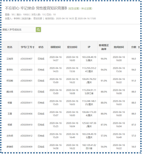 接下来,李序科同志根据学校组织部下发的组织生活安排及样板支部创建工作的既定工作安排,在研读《中国共产党党员教育管理工作条例》、《中国共产党问责条例》、《中国青年志愿者协会简介(摘选)》、《大学生志愿服务西部计划项目介绍》以及《学习强国》中志愿者精神、公民道德建设实施纲要、习近平总书记在“不忘初心 牢记使命”主题教育总结大会上的讲话等文件材料基础上,创建了包括单项选择15题、多项选择15题、判断20题共计50题的知识竞赛网上试卷,同时将以上文件提前挂在超星网络教学平台上并于15日开放以方便支部成员签到学习。4月16日下午3点,预计2小时的知识竞赛正式拉开序幕。李序科同志首先利用平台宣布了知识竞赛的整体流程和答题要求,同志们在结束RedDragon 网络会议后纷纷进入平台签到答题。到下午5点知识竞赛正式结束时,先后有13名党员同志准时参与知识竞赛,经电脑自动计分统计,兰桂萍同志荣获一等奖、柯佳敏、李序科同志荣获二等奖、王勇、杨露、魏冰娥同志荣获三等奖。