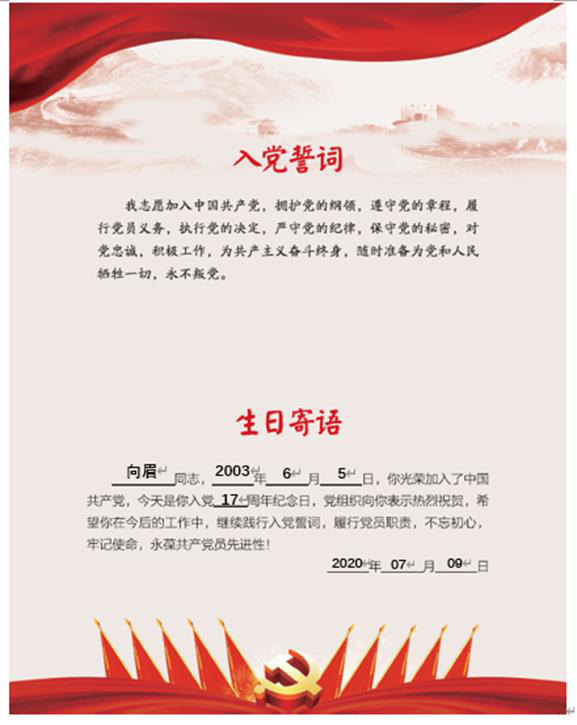 最后,支部利用此次党日活动契机,给向眉老师过了一次有意义的“政治生日”,向眉老师通过分享自己入党故事,回忆了入党初心,重温了入党誓词,在回忆分享中也收获了其他党员的生日祝福和成长寄语。