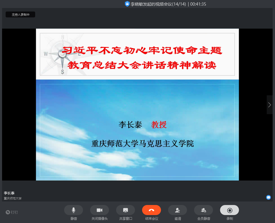 党委部署要求——面向全体党员师生常态化开展党员教育“七个一”活动,2020年7月9日下午一点半,马克思主义基本原理概论党支部(简称马基原支部)通过钉钉会议召开了“党员教育‘七个一’活动”系列之一:以“党课开讲啦”为形式的党日活动。支部全体成员到会,本次活动由支部书记李长泰教授主持。