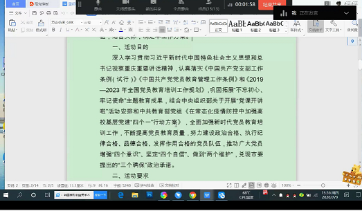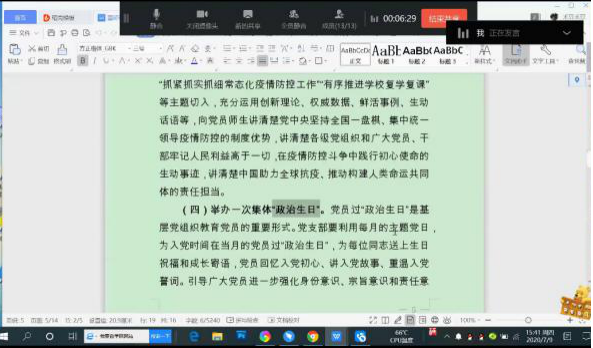集中之后通过钉钉会议召开了以“党员教育‘七个一’活动”系列之一“承诺实践活动”为主要内容的组织生活会。