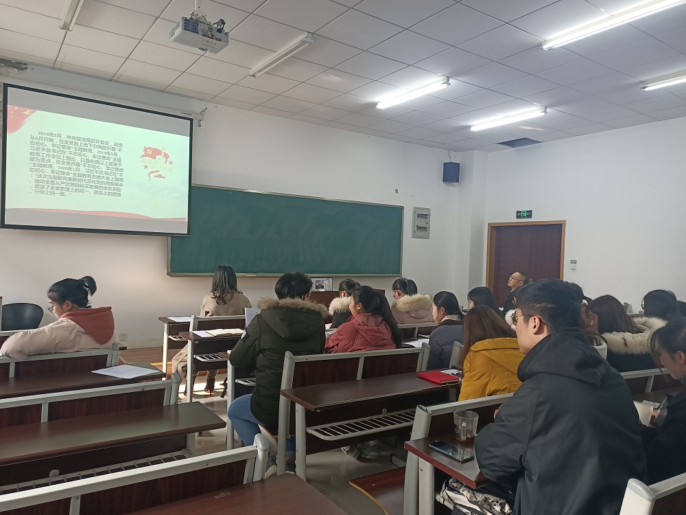 会前,本支部要求全体党员认真自学“不忘初心、牢记使命”主题教育的相关材料,结合《新时代党员干部学习关键词(2020版)》提升对习近平新时代中国特色社会主义思想的认识,明确新时代党员的使命担当。会中,支部同志通过知识问答,如:中国共产党的初心和使命内容是为中国人民谋幸福,为中华民族谋复兴、“四个伟大”内容、“四个意识”等知识来加深本次的主题学习;接着,支部成员集体观看视频:《习近平主席新年贺词》,并根据会前学习和视频内容,依次发表了自己的学习心得。其中,邓芳同志就机遇和挑战,只有牢记初心才能获得源源不断的动力为主题发表自己的感悟;邓淑月同志表示正是因坚守了初心,中国才会奋起,复习党章,温习知识,我们才会明白未来的路该如何走;胡沁莹同志结合自身实际,提出当代大学生要培养担当精神,认识到中国梦实现的意义,培养担当的过程就是思想政治教育的过程,应当进一步学习思想政治教育的相关内容。最后,刘洪同志对本次党日活动进行总结,要求支部全体党员按照党的目标走,在未来,希望支部全体党员把之前的学习带到生活中去,为人民服务,积极践行初心。在实习中,要把我们自身形成的优良价值观传播到更多学生心里。同时,党支部宣传委员方敏同志也提出,大家要深刻入党初心,作为党员,有自己的使命和任务,要提高觉悟、深化理论认识到每个人心中,要明白作为一名学生、作为一名教师应该如何提高自己的思想意识。