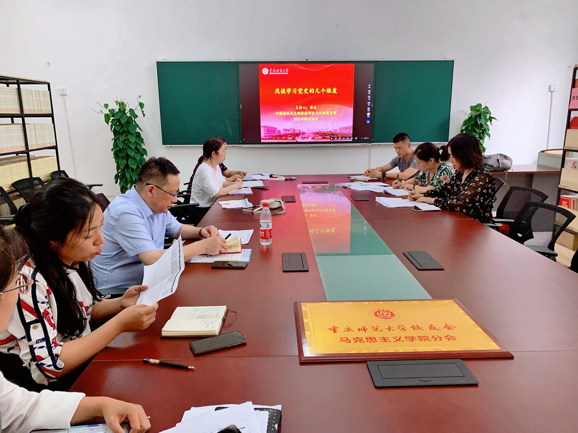 本次会议的主要内容是支部书记黄正同志讲党课,主题是浅谈学习党史的几个维度。他从四个方面出发阐释了我们学习党史的几个维度。首先,处理好宏观与微观之间的关系。他通过列举遵义会议等历史上的重要会议,阐述了如何从微观层面去了解他们的重大意义。其次,坚持政治性,反对历史虚无主义。第三,注重形式与内容相结合。古人云,学无定法,唯有德法,并倡导通过情景式教学的方式开展党史学习。最后,基础是学,关键是做。作为一名高校思政课教师,不但要深入学习党史知识,同时也要注重党史知识的输出,惠及大众。