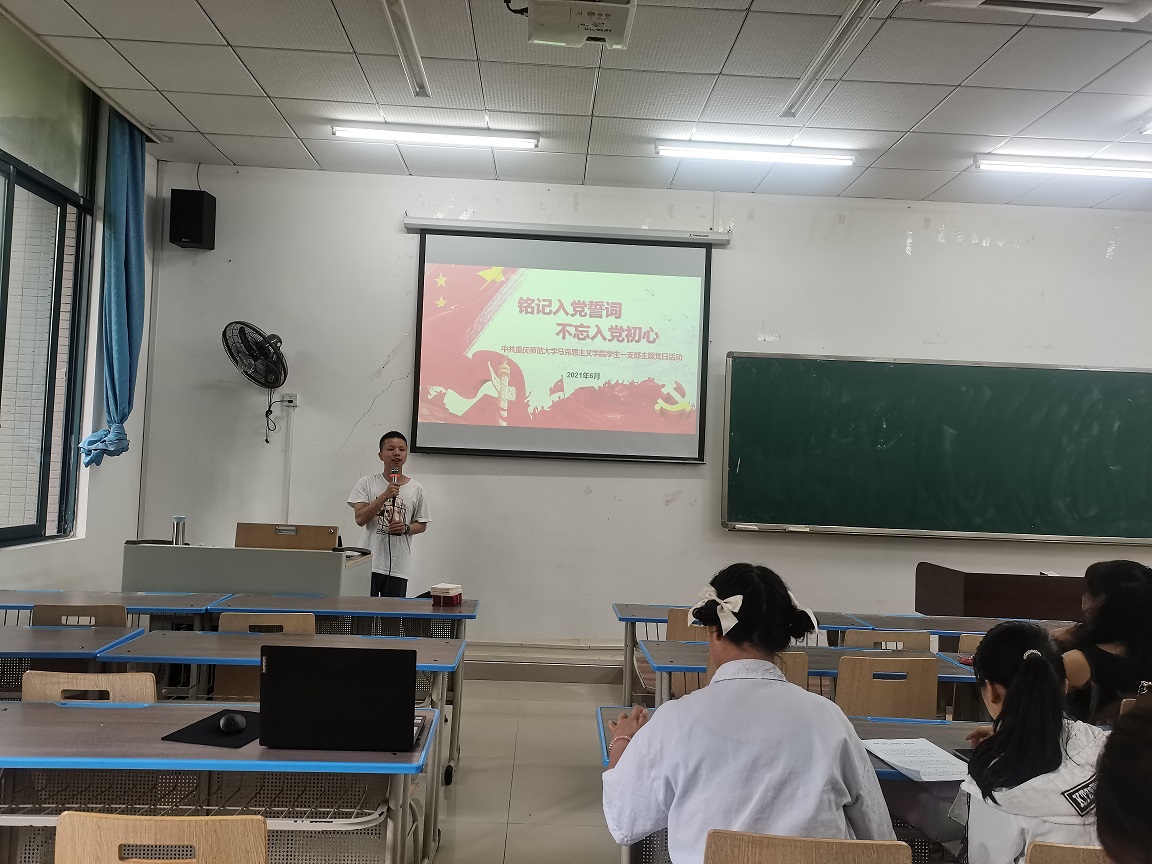 学生一支部积极响应上级党组织学党史的号召,于6月24日下午15:00在汇贤楼109开展了“铭记入党誓词,不忘入党初心”主题党日活动,会议由符路同志主持,支部全体党员与会。