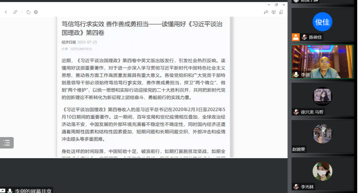 研究生第一支部通过腾讯会议平台开展云端主题为“强化理论武装,突出政治功能”的主题党日活动,会议由支部书记李剑主持。