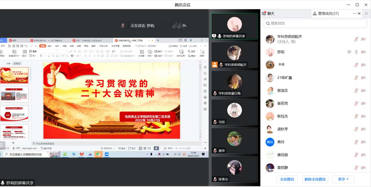 为全面深入学习党的二十大精神,10月27日下午,研究生第二支部用腾讯会议开展了“学习党的二十大精神”主题党日活动。全体党员参会,组织委员罗莉同志主持了会议。