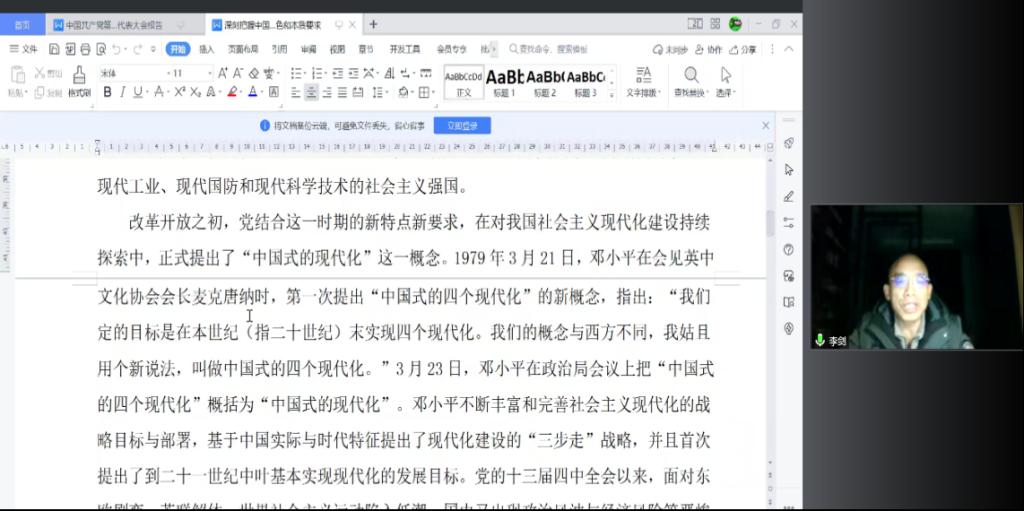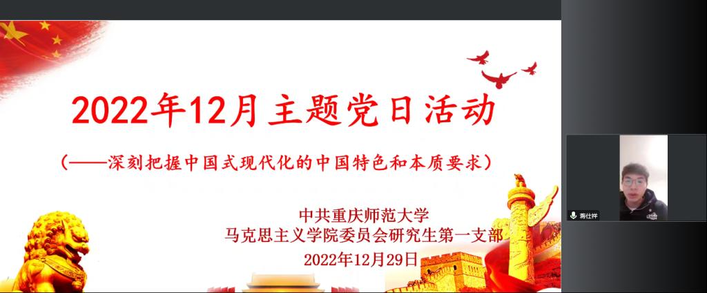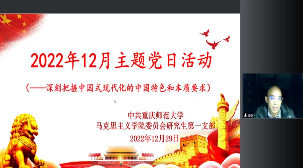 研究生第一支部通过腾讯会议平台开展云端以“深刻把握中国式现代化的中国特色和本质要求”为主题的党日活动,会议由支部书记李剑同志主持。