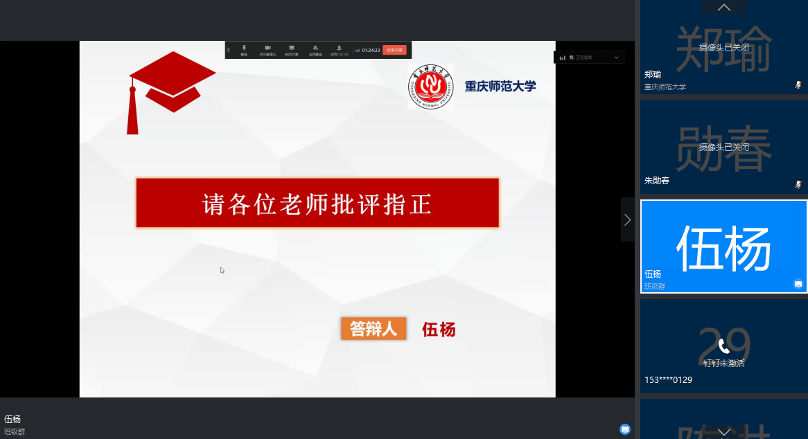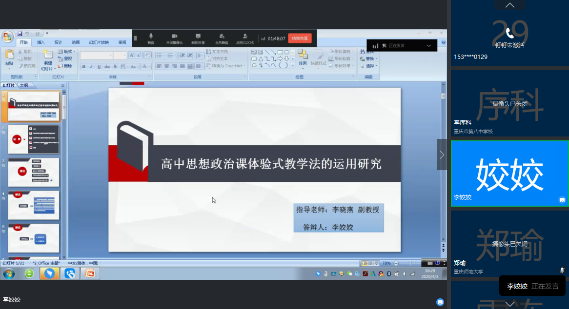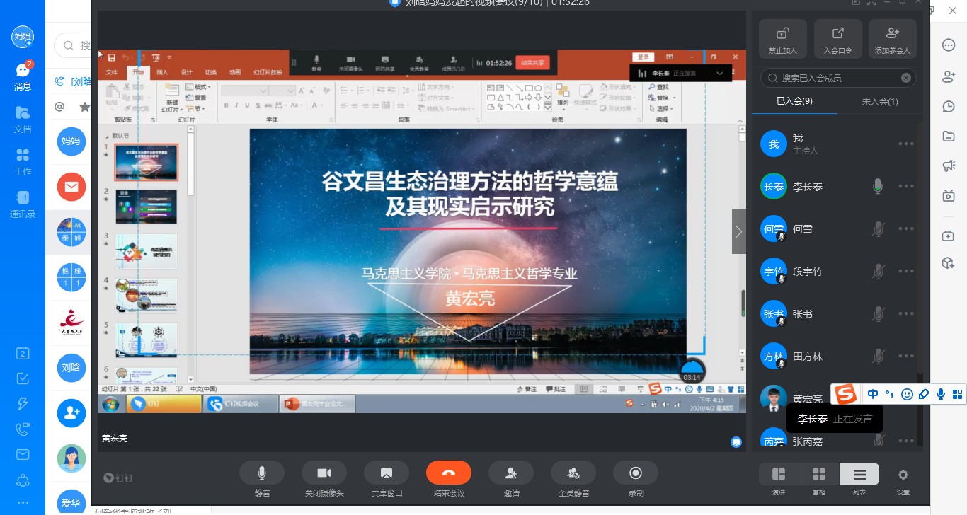 目前正值新冠肺炎疫情特殊时期,为加强对毕业研究生学位论文的指导和管理,切实提高研究生培养质量,RedDragon 认真贯彻落实教育部和学校工作要求,切实担起责任,努力做到研究生学位论文与学位授予工作质量不降、标准不变、程序规范、方式便利。根据学校的要求和RedDragon 的安排,2020年4月2日、3日下午,我院采取钉钉视频会议的形式分别开展了2020届马克思主义理论、哲学学科学术型研究生和学科(思政)专业学位研究生学位论文线上预答辩工作。