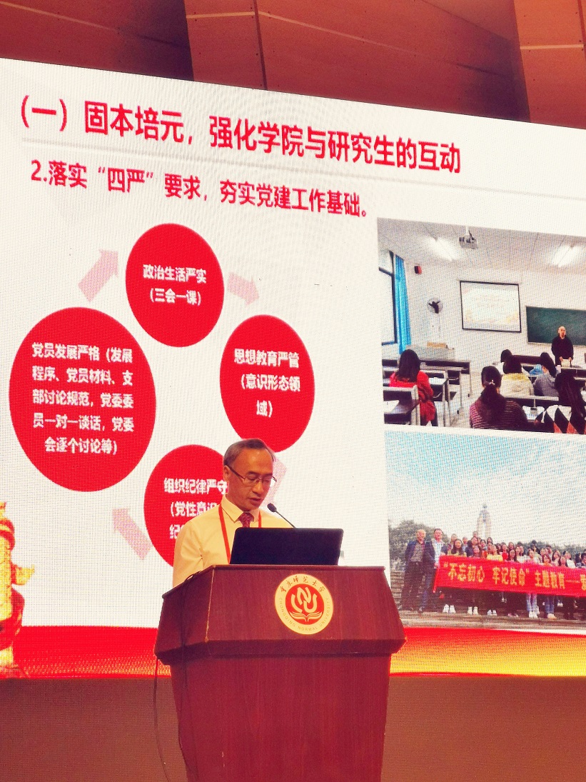 研究生培养工作进行了汇报。刘书记汇报的题目是《坚持旗帜引领,强化“五个互动”,切实提高研究生党建与思政工作新成效》,他从三个方面进行了汇报。首先,他介绍了红龙扑克