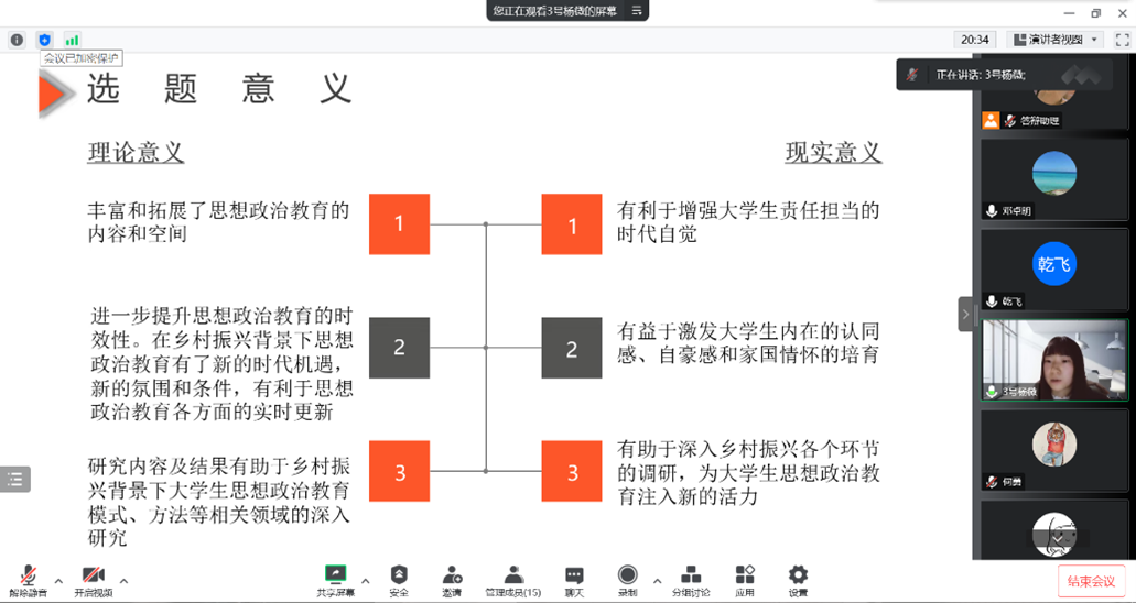 开题报告会从上午8:45进行到下午13:30。本次开题报告会帮助研究生深刻认识到论文选题及框架结构中存在的不足,同时也拓宽了研究思路及学术眼界,为论文初稿的撰写奠定了坚实基础。同时,此次开题报告会对于旁听的2022级研究生同学来说,也是一次很好的观摩学习机会,帮助他们开阔了视野。