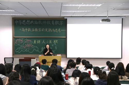 特邀巴蜀中学思想政治学科王欢老师,在求是楼213作题为“高中政治教学的实践与思考——与未来思政教师的对话”的讲座。讲座由学院政教系副主任彭君君博士主持,我院思想政治教育专业本科生和思政专业“协同提质计划”本科学生参加。