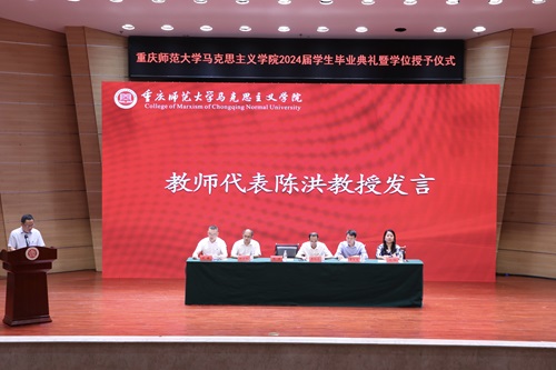 典礼第四项议程,教师代表陈洪教授上台致辞。陈老师首先祝贺2024届所有毕业学子顺利毕业,并对全体领导和老师对学生们的关心、爱护表示感谢。陈老师结合时代需求对毕业生们提出了三点要求:一是要做一个有情怀的人,积极向上、锐意进取,成为一个有家国情怀、教育情怀、仁爱情怀的人;二是要做一个有节操的人,希望同学们不断调整心态、矫正状态、不碰红线、不移底线、坚守节操;三是要做一个能进取的人,始终不减进取之心、不变向上之心,但求耕耘、莫问收获,希望同学们拥有一个有高度、有亮度、有厚度的美好人生。