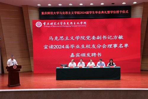 典礼第六项议程,方敏宣读2024届毕业生校友分会理事名单,并颁发聘书。根据重庆师范大学校友会推荐2024届毕业年级校友分会理事通知有关要求,经各班级推荐和学校校友会同意,任命3名本科毕业生、1名硕士毕业生为重庆师范大学校友会2024届毕业年级校友分会理事。力成为可堪大用、能担重任的栋梁之才。