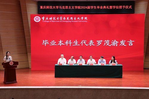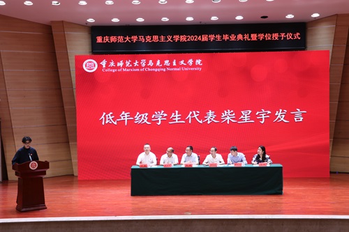 全体领导、老师的辛勤付出和言传身教,并承诺全体同学都将牢记重师马院人的身份,矢志不渝地追求人生理想,做“崇德、尚美、博学、笃志”的重师马院人。低年级学生代表柴星宇在对毕业生表达美好祝愿的同时也呼吁低年级学生:一要坚守理想信念、筑牢思想根基;二要陶冶道德情操、锤炼高尚修养;三要涵养扎实学识、练就过硬本领;四要勤修仁爱之心、坚持服务贡献。