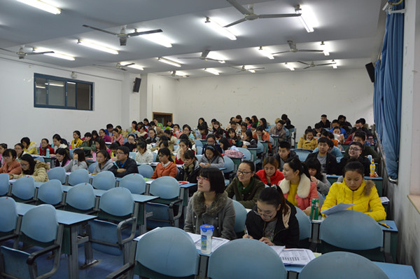 胡老师从批改模拟试卷中存在的问题出发,一一对应做出分析并要求同学们养成规范答题的好习惯,特别是在填涂机读卡时应当认真严谨,并告诫同学们“失之毫厘,谬以千里”的道理。接着,胡老师将去年和今年的考试大纲作了比较,勾画出重难点并希望同学们平时加强训练。“大鹏之动,非一羽之轻;骐骥之速,非一足之力。没有平时的汗水是不会有光辉的成绩的”,胡教授如是说道。
