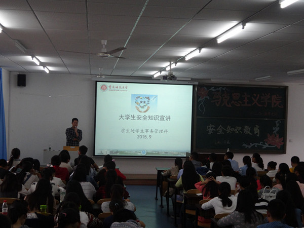 新生入学教育之大学生安全知识教育讲座于特教楼2505教室隆重开展。2015级辅导员马小又老师主持讲座,校学生处学生事务管理科李鑫老师担任此次讲座主讲人,2015级全体新生参与。