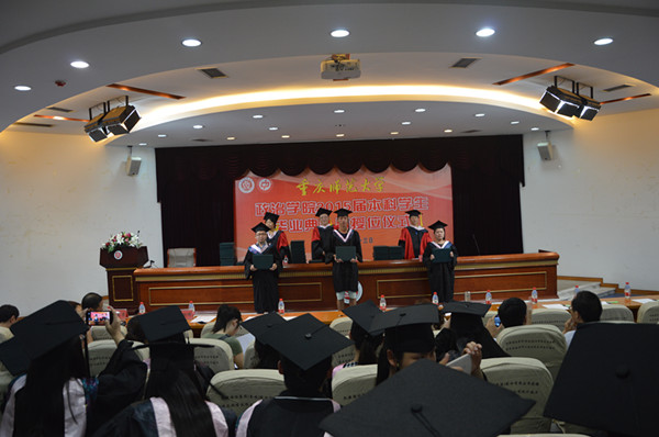 毕业典礼结束后,进行了授位仪式。在院学位委员会主席陈洪宣读了《重庆师范大学学位委员会授位决议》后,院学位委员会陈洪、孔毅、祝玉峰为获得学士学位的172名毕业生逐一颁授学位证。